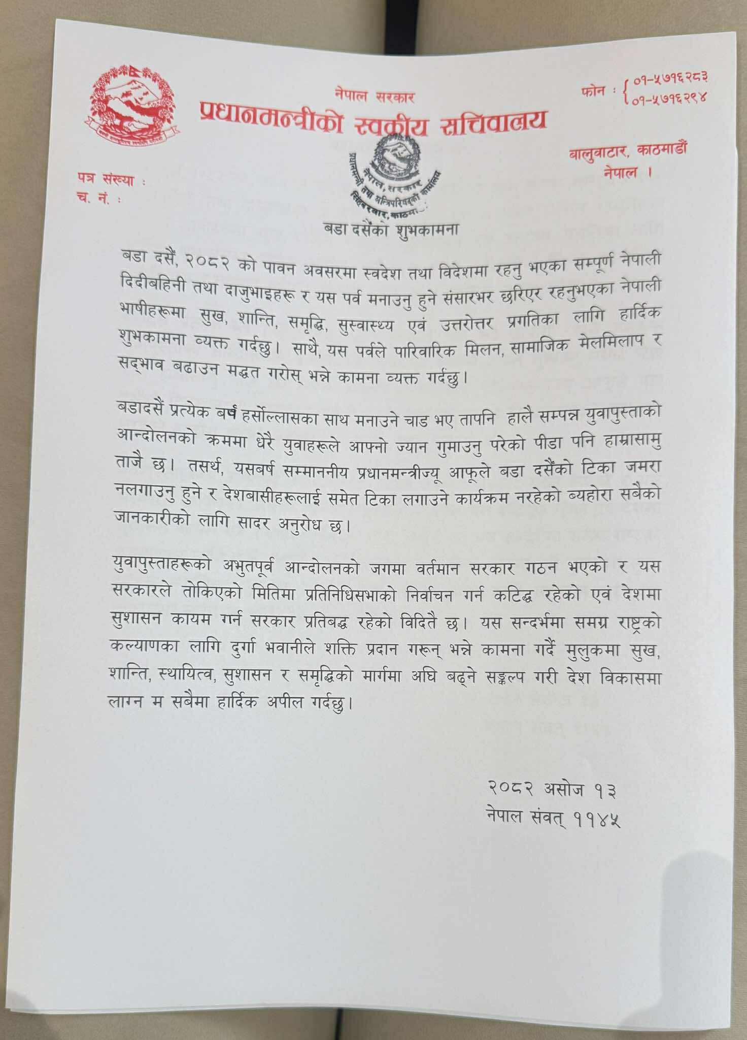 विज्ञप्तीमा भनिएको छ, ‘बडा दशैँ प्रत्येक बर्ष हर्सोल्लासका साथ मनाउने चाड भए तापनि हालै सम्पन्न युवापुस्ताको आन्दोलनको क्रममा धेरै युवाहरूले आफ्नो ज्यान गुमाउनु परेको पीडा पनि हाम्रासामु छ। तसर्थ, यसबर्ष सम्माननीय प्रधानमन्त्रीज्यू आफूले बडा दसैंको टिका जमरा नलगाउनु हुने र देशबासीहरूलाई समेत टिका लगाउने कार्यक्रम नरहेको ब्यहोरा सबैको जानकारीको लागि सादर अनुरोध छ।’