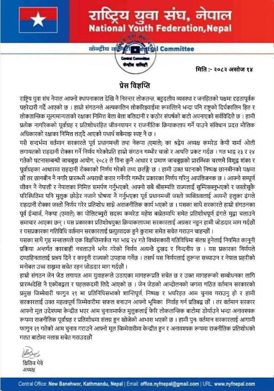 ओलीको राहदानी रोक्का र बस्नेतविरूद्ध अनुसन्धानको तयारीपछि युवासंघले निकाल्यो विज्ञप्ति