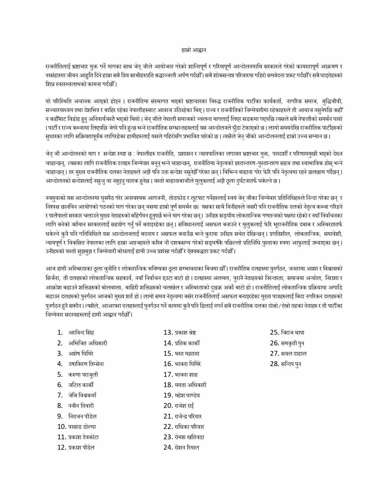 विज्ञप्तिमा भनिएको छ, ‘लामो समय नेतृत्वमा बसेर राजनीतिलाई असफल बनाइरहेका मुख्य पात्रहरूलाई बिदा नगरिकन दलहरूको पुनर्गठन हुनै सक्दैन । त्यसैले, आ-आफ्ना दलहरूलाई पुनर्गठन गर्ने काममा कुनै पनि ढिलाइ नगर्न सबै राजनीतिक दलका दोस्रो/तेस्रो तहका नेताहरू र ती पार्टीका जिम्मेवार सदस्यहरूलाई हामी आह्वान गर्दछौँ ।’
