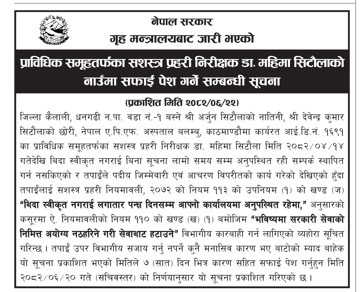 सशस्त्रकी इन्सपेक्टर डा. सिटौलालाई सेवाबाट हटाउने तयारी,नेपाल प्रहरीका १८ जनालाई सात दिनभित्र उपस्थित हुन निर्देशन