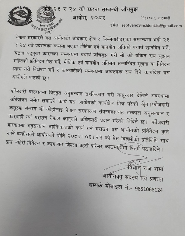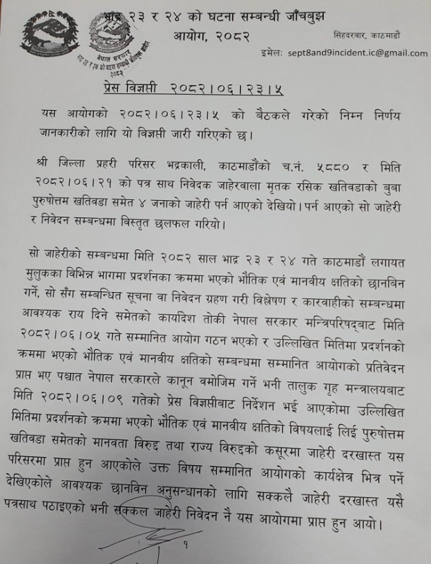 आयोगद्वारा जारी विज्ञप्तिमा भनिएको छ, ‘फौजदारी कसूरमा संलग्न जोकोहीलाई नेपाल सरकारका संयन्त्रहरूबाट तत्काल अनुसन्धान र कारबाही गर्न-गराउन नेपाल कानूनले अख्तियारी प्रदान गरेको विदितै छ । फौजदारी वारदातमा अनुसन्धान तहकिकातको कार्य गर्न गराउन यस आयोगको प्रतिवेदन कुर्न नपर्ने व्यहोराको आयोगको मिति २०८२।०६।२१ को प्रेस विज्ञप्तीको प्रतिलिपि साथ प्राप्त जाहेरी निवेदन र कागजात जिल्ला प्रहरी परिसर काठमाडौंमा फिर्ता पठाइदिने ।’