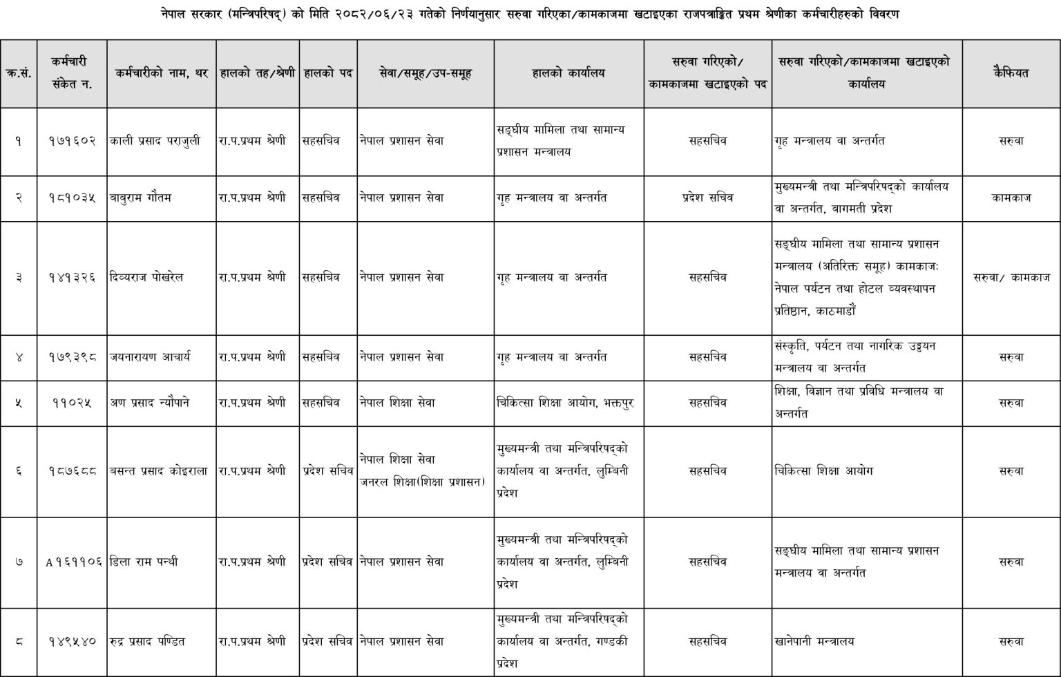 ‘नेपाल न्याय सेवा, न्याय समूह राजपत्रांकित प्रथम श्रेणीका ८ जना अधिकृतहरूको सरुवा गर्ने निर्णय भएको छ,’ सञ्चारमन्त्री खरेलले भने ।