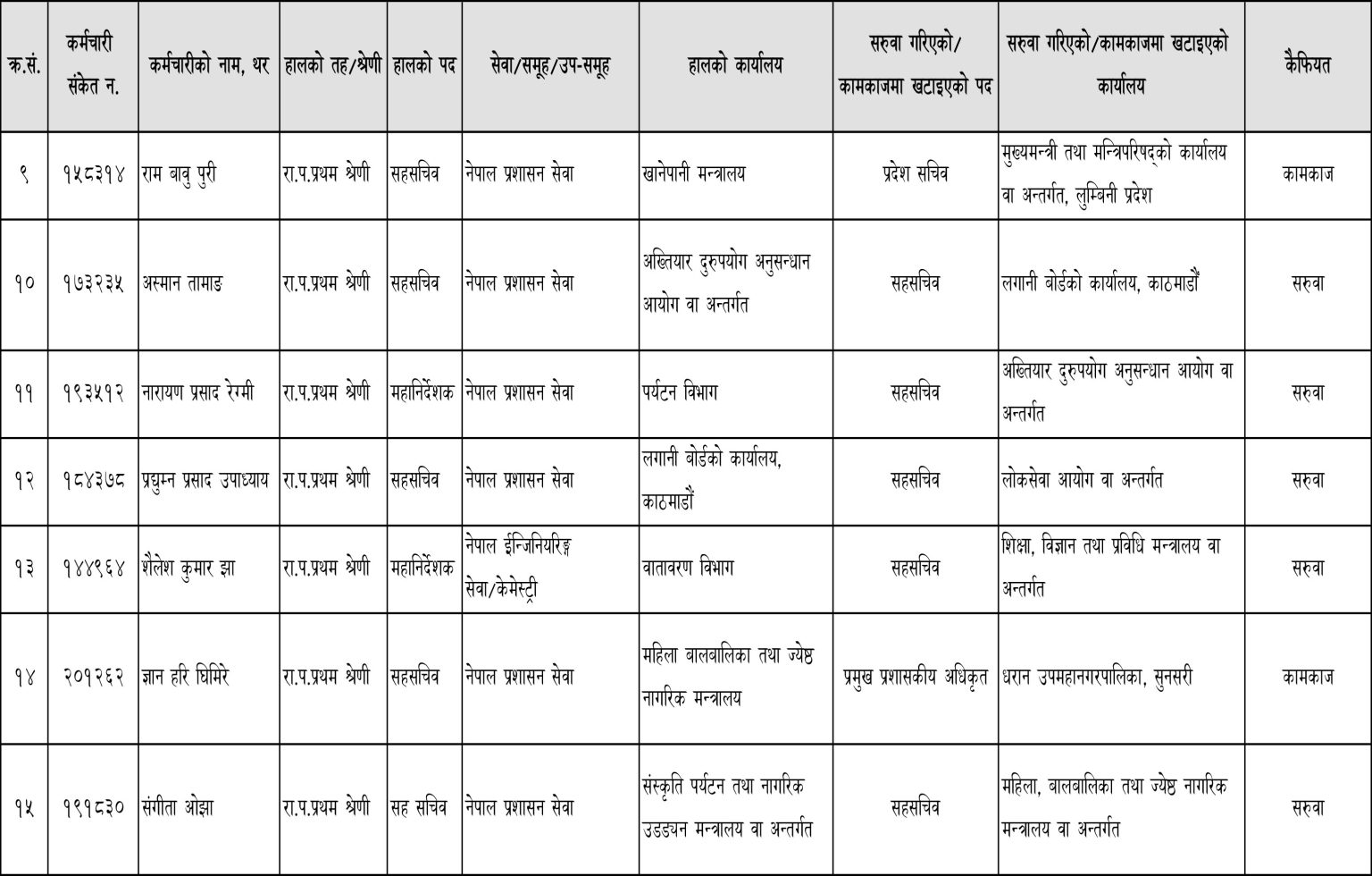 संघीय मामिला तथा प्रशासन मन्त्रालय, गृह मन्त्रालय, खानेपानी मन्त्रालय, चिकित्सा शिक्षा आयोग लगायतमा कार्यरत १५ जना सहसचिवको एकैसाथ सरुवा भएको हो ।