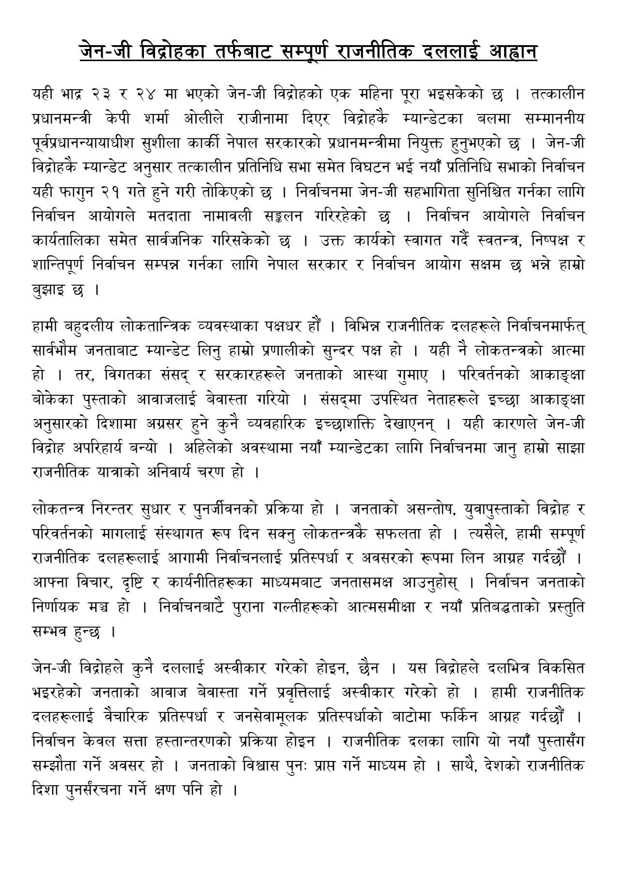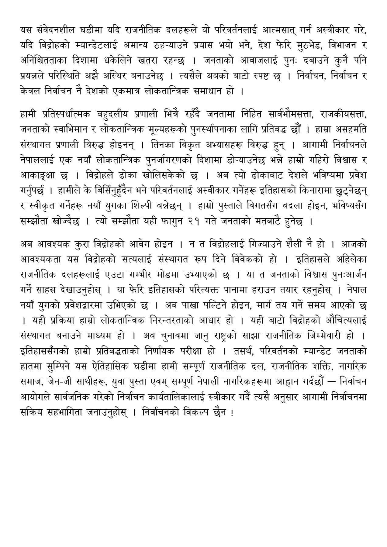 परिवर्तनको म्यान्डेट जनताको हातमा सुम्पिने ऐतिहासिक घडीमा सम्पूर्ण राजनीतिक दल, राजनीतिक शक्ति, नागरिक समाज, जेन-जी साथीहरू, युवा पुस्ता एवम् सम्पूर्ण नेपाली नागरिकहरूमा निर्वाचनमा लाग्न अपिल गरेको छ।